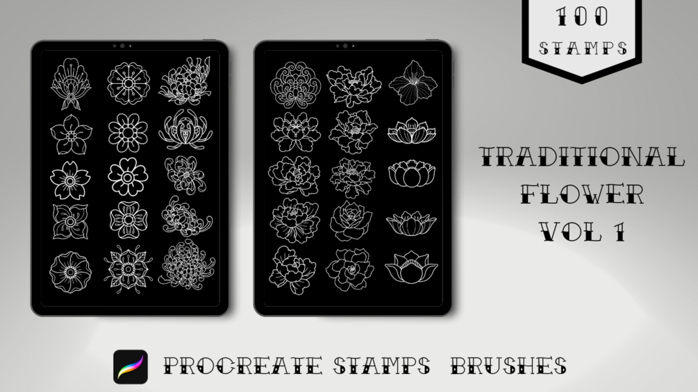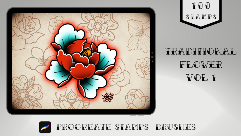 100 Procreate Traditional Flower Maker Tattoo Stamps | Procreate Brushes | Tattoo Design | For iPad