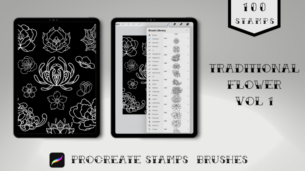100 Procreate Traditional Flower Maker Stamps For iPad stencils High Resolution. ( Hand drawn )