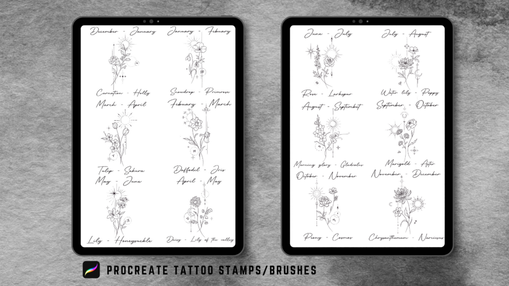 60 Procreate Birth Month Flowers Tattoo Stamps stencils High Resolution. ( Hand drawn )