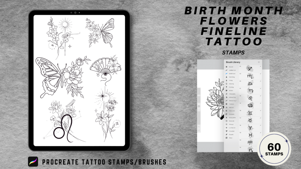 60 Procreate Birth Month Flowers Tattoo Stamps | x Zodiac Sign x Horoscope x Hand Fan x Butterfly Tattoo Stamps