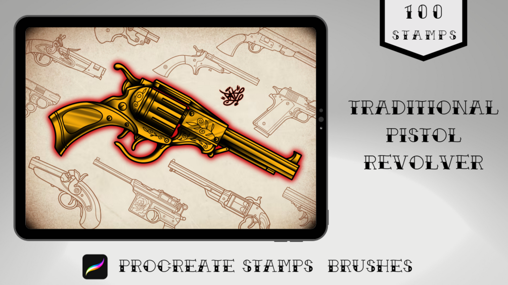 100 procreate Pistol, Handgun, Flinlock stamps | procreate brushes | tattoo design | Save your time | For Ipad, Ipad Pro