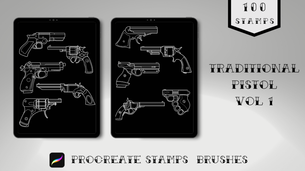 100 procreate Pistol, Handgun, Flinlock stamps | procreate brushes | tattoo design | Save your time | For Ipad, Ipad Pro